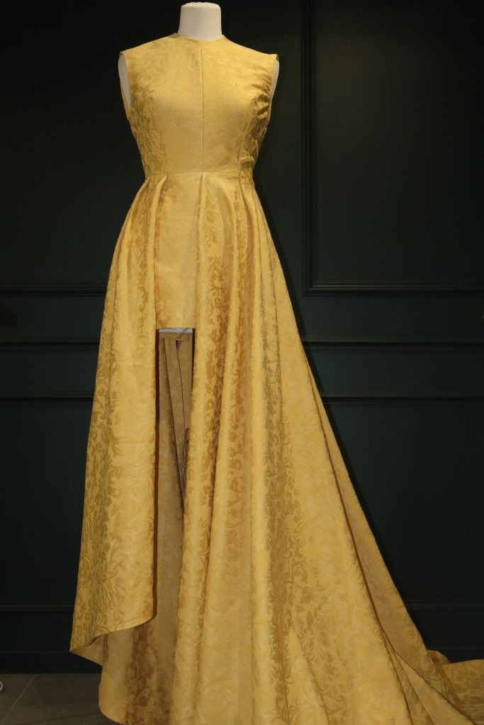 Chaque détail de cette pièce semble murmurer une histoire. Les ornements subtils et les reflets opulents du tissu rappellent les fastes des cours royales, où le raffinement et le prestige étaient à l’honneur. Sa silhouette, soigneusement conçue, puise dans les codes historiques, revisitant avec grâce les lignes et les volumes qui ont marqué les siècles passés.